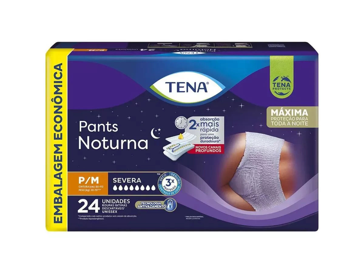Carregando...A Roupa íntima Tena Pants Noturna é uma roupa íntima descartável e unissex de rápida absorção, proporcionando ao usuário máxima proteção durante toda a noite. É indicado para pessoas com mobilidade e com perdas de urina severa. Além disso, é muito confortável (elásticos suaves em volta da cintura permitindo uma adaptação perfeita ao corpo), segura e de fácil uso, como uma roupa interior (calcinha ou cueca). A excepcional segurança deve-se à sua tecnologia antivazamento, que tem um núcleo de alta absorção - posicionado para também dar segurança na posição deitada, que absorve rapidamente grandes quantidades de urina mantendo-a longe da pele, assim o usuário permanece seco, reduzindo significativamente o risco de irritações ou infecções cutâneas. As roupas íntimas Tena noturnas são projetadas para lidar com um fluxo urinário mais intenso durante a noite, para ter uma noite tranquila sem preocupações com vazamentos. São destinadas a serem usadas durante toda a noite, mantenham a pele seca e protegida por um período mais longo, minimizando o desconforto e o risco de irritações. Proteção durante longos períodos, recomendadas para uso durante toda a noite, mantendo a pele seca. Possui controle de odor para minimizar o odor desagradável, mantendo uma sensação de frescor e higiene.